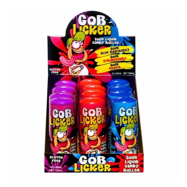 Gob Licker Assorted Sour Liquid Candy Roller 60ml is a pack of 12 sour liquid candy rollers that come in three delicious flavors: blue raspberry, grape, and strawberry. The rollers are filled with a sour liquid that can be rolled directly onto your tongue, providing a burst of flavor that is sure to leave your taste buds tingling. \n\nThe rollers are also portable, so you can take them with you wherever you go. They are perfect for parties, movie nights, or simply satisfying your sweet tooth.\n\nFeatures:\n\nVariety of sour flavors\nPortable and easy to use\nPerfect for parties, movie nights, or simply satisfying your sweet tooth\nA fun and exciting way to add a little bit of sour to your day
