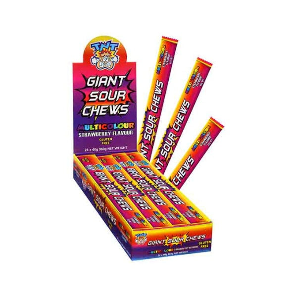Mouthwatering! Absolutely delish chews coated in a puckering powder - these candies are the perfect combo of sweet and sour. Just like the ones from your childhood, TNT make only the best confectionary. Whether you're filling lolly bags for your next party, loading up a sweets table, or getting prepped for Halloween, this 24-Pack is your candy sidekick. \n\nFeatures:\n\nTNT Giant Sour Chew Bars\nPack contents: 24 x 40g bars\nFlavour: Strawberry\nFizzy, sherbet style chewy bars\nMassive box of delicious lollies \nFun sweet and sour combo \nPerfect for party bags, dessert tables and Halloween \nComes in individual packets, so they'll stay fresh