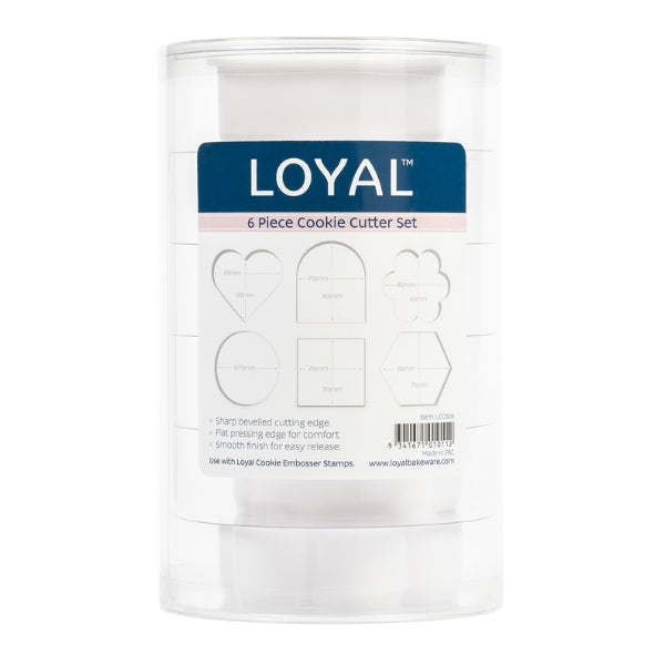 The LOYAL 6-piece plastic cookie cutter set is a versatile baking tool to make cookie preparation a breeze! Our cutters feature a sharp bevelled cutting edge that is specifically designed to effortlessly cut dough, leaving your cookies with clean and defined shapes.\n\nEquiped with a flat pressing edge that ensures comfort when pressing down. Cutters also leave a smooth finish for easy release! Additionally displayed in a plastic container with a window lid, allowing you to see the contents and shapes when closed.\n\nNote: The cookie cutters create the perfect canvas for Loyal Cookie Embosser Stamps\n\nShapes 30mm (H):\n\nHeart - 85 x 65mm\nArch - 70 x 80mm\nFlower - 80 x 60mm\nCircle - 75mm\nSquare - 70 x 70mm\nHexagon 85 x 75mm
