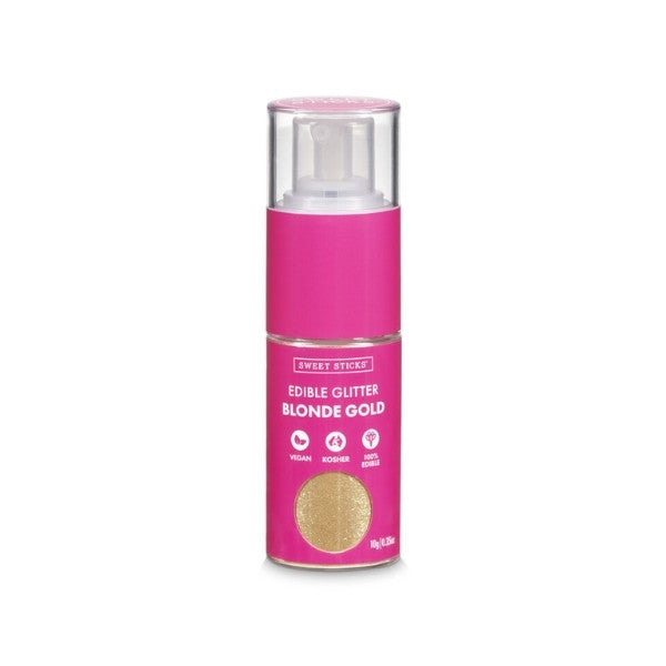 Applying glitter to your cakes, cupcakes and cookies has never been easer with Sweet Sticks Edible Glitter Pump Sprays.\n\nIt?s quick, less fuss and works beautifully on most mediums such as buttercream, fondant and ganache.\n\nOur Glitter Pump range comes in 4 colours:\n\nPearl\nFrosted Silver\nBlonde Gold\nVegas Gold\nSlightly pump directly onto the area you wish to decorate. The closer you are to your creation the more concentrated the glitter will be. If you are looking for a less concentrated area, pump the glitter further away.\nSize: 10g\nIngredients: Mica-Based Pearlescent Pigments, E171 (Titanium Dioxide) & E172II (Red Iron Oxide)\nMay contain traces of milk, sulphites, soy and hazelnuts\n100% Edible