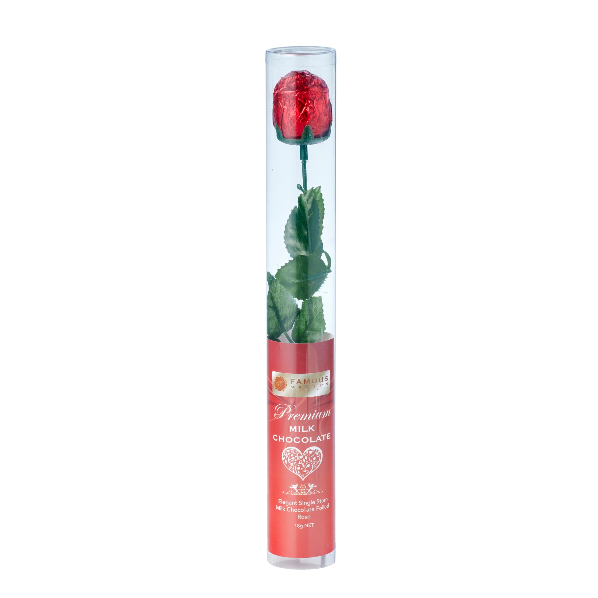 Satisfy your sweet cravings with Famous Makers Milk Chococolate Rose Cylinder 18g (single rose)!