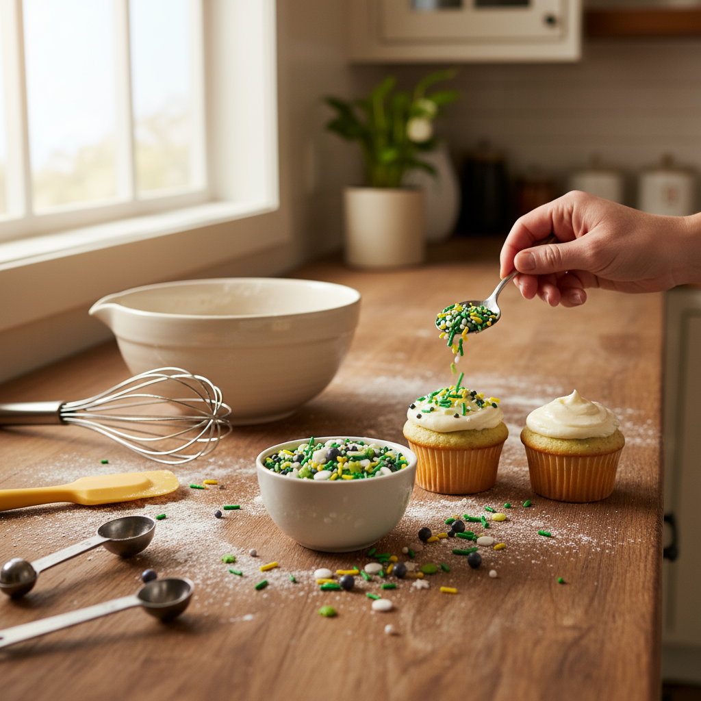 Goal! Sprinkle Mix\n\nYour desserts will be a goal scoring success with this sprinkle mix inspired by the world game. Includes white soccer balls, black and white sugar pearls, green and white stars, green and yellow jimmies, green and yellow nonpareils.Gluten Free, Vegan Friendly, Dairy Free