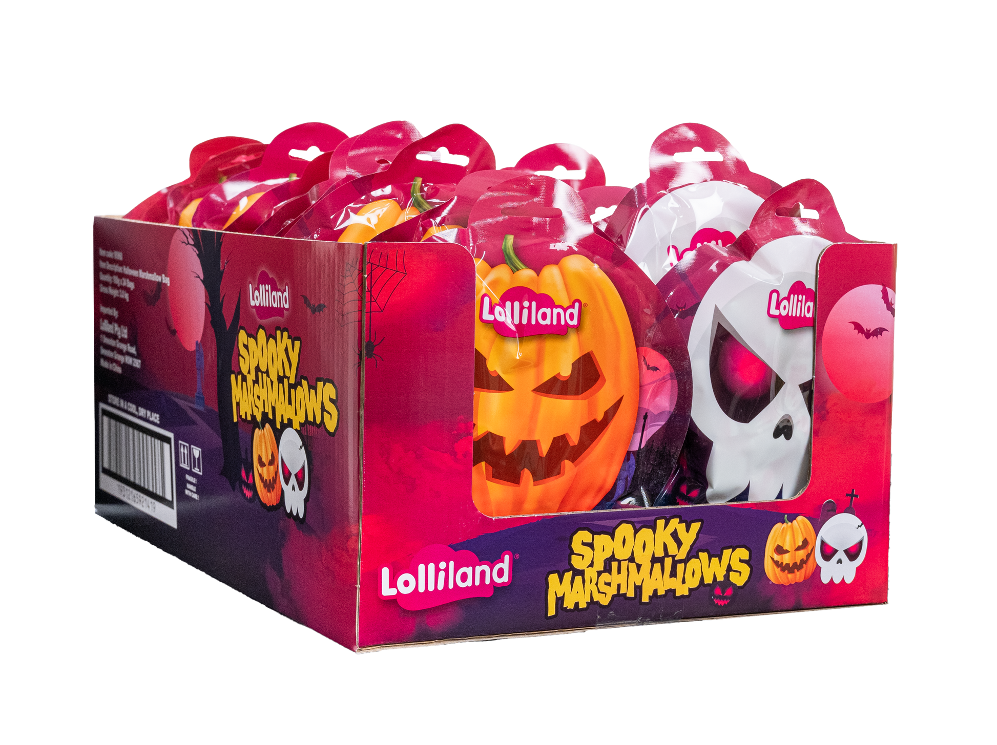 Soft, vanilla Halloween themed marshmallowsin a Pumpkin or Skull shaped bag.