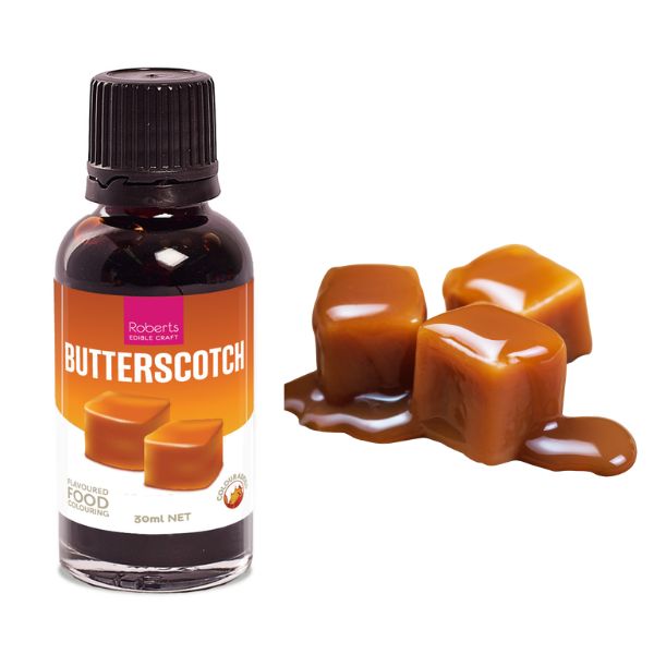 Roberts Butterscotch Flavour Colour 30ml\n\nOur Flavoured Food Colourings are an opaque coloured water soluble flavoured food colouring. \nThey add flavour and colour whilst matching the aromatic scent. \nThey are unique that each drop you add does the two steps in one, which makes them perfect for flavouring and colouring icings and frostings. \n\nBaking & Dessert Application:\nAdd to icings, cake & biscuit batters, fondant creme, fillings, ice-cream & macarons when you want intensity of flavour matched with the fragrance of the flavour.\n\nFlavoured Food Colourings are a great addition to create a flavoured soft centred filling for chocolates.\nNote: Flavoured Food Colourings are not suitable to flavour chocolate. It may cause the chocolate to seize, as you as you are adding a water-based product to an oil based product. \n\nOnce opened, stored in cool dry conditions away from direct sunlight and heat. Shelf life is greater than 24 months if stored correctly.\n\nContents: 30 ml\nSuitable for Halal and Kosher dietary requirements\nSuitable for Vegan & Vegetarian Dietary requirements\n\nMade in Australia from Imported Ingredients.
