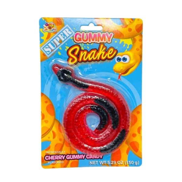 Super Gummy Cherry Snake 150g is a delicious and chewy treat that is sure to satisfy your sweet tooth. This jumbo cherry snake is made with real cherry flavor and is coated in a sour sugar that will leave your taste buds tingling. It is the perfect size for snacking on the go or sharing with friends.\n\nFeatures:\nLarge 150g size\nDelicious and chewy treat\nReal cherry flavor\nSour sugar coating\nPerfect size for snacking on the go\nGreat value for the price